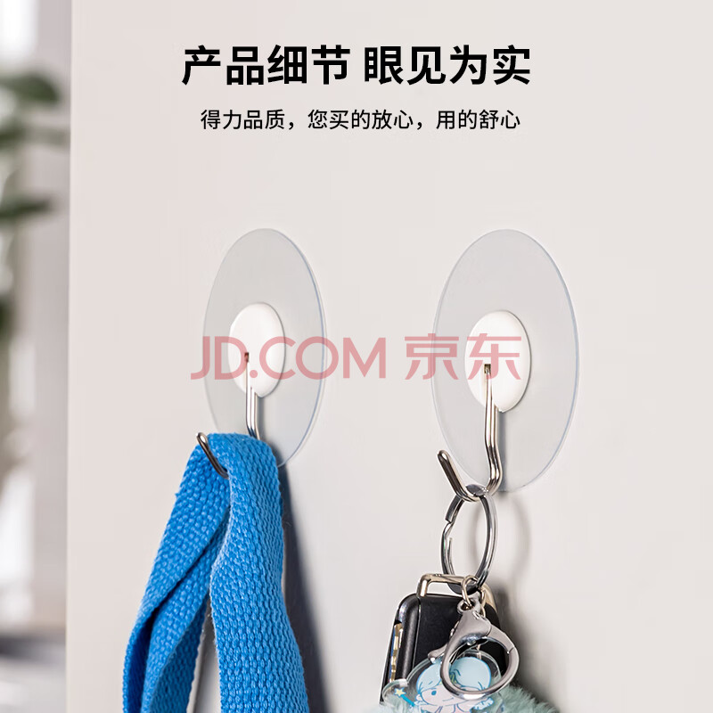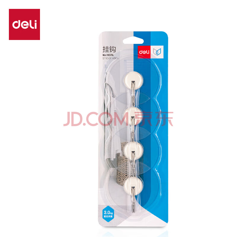 商品相册:得力(deli)强力胶粘挂钩 3kg承重 免钉胶粘免打孔 浴室门后卫生间 大学必备生活用品寝室 4只/卡 19374第1张/共5