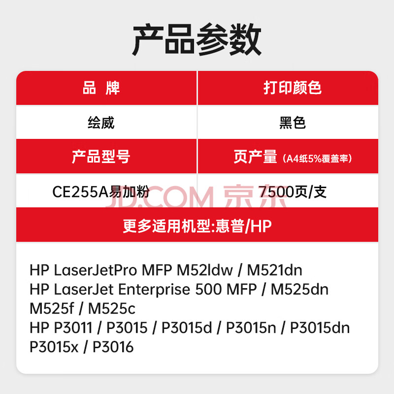 商品相册:绘威CE255A 55A易加粉硒鼓 适用惠普hp P3015 M521dn m521dw M525dn M525f佳能CRG-324 LBP6750 LBP6780x墨盒第