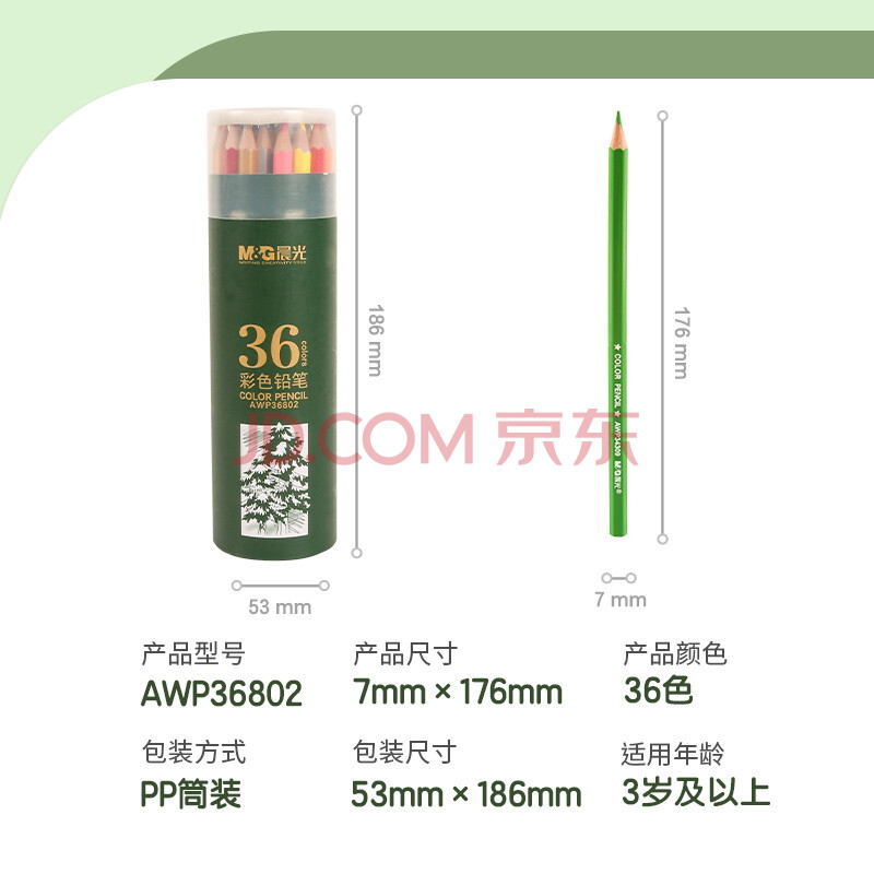 商品相册:晨光(M&G)文具36色油性彩色铅笔学生美术绘画填色绿筒老师AWP36802儿童女孩生日开学礼物第1张/共8