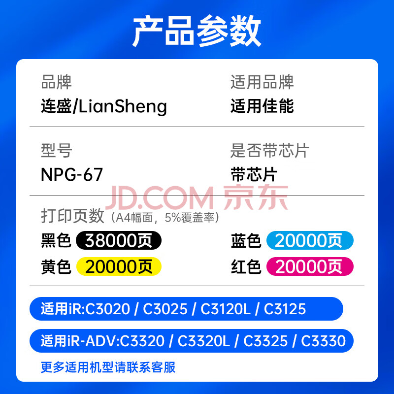商品相册:连盛npg-67粉盒适用佳能c3222l c3020 c3125 c3130l c3120l C3130L 3222 3520 打印机墨盒c3226墨粉盒黑色第