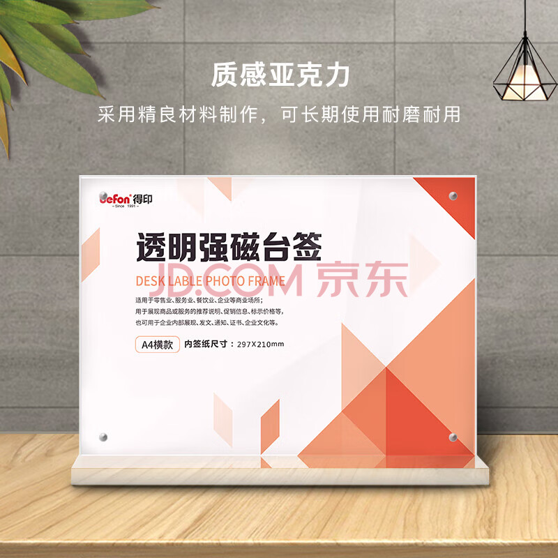 商品相册:得印T型亚克力桌牌台签 高清透明台卡工位牌 强磁双面 210mm*297mm 座牌会议展示牌 A4横款立牌8917第