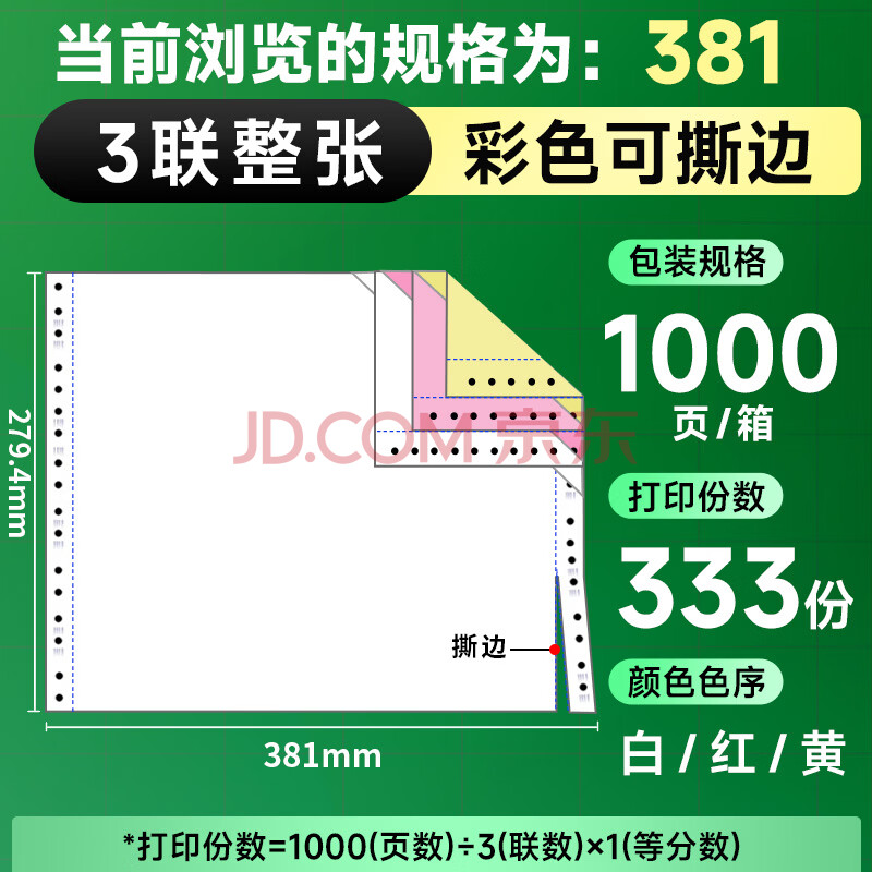 商品相册:天章 (TANGO)【缺页十倍赔】新绿天章三联整张针式打印纸 撕边电脑打印纸 出入库送货单(381-3S 白红黄 1000页)第