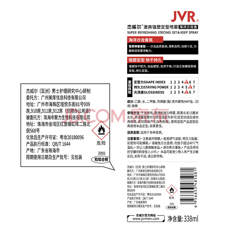 商品相册:杰威尔男士激爽强塑定型喷雾338ml(造型干胶 发胶喷雾 干爽持久定型)第