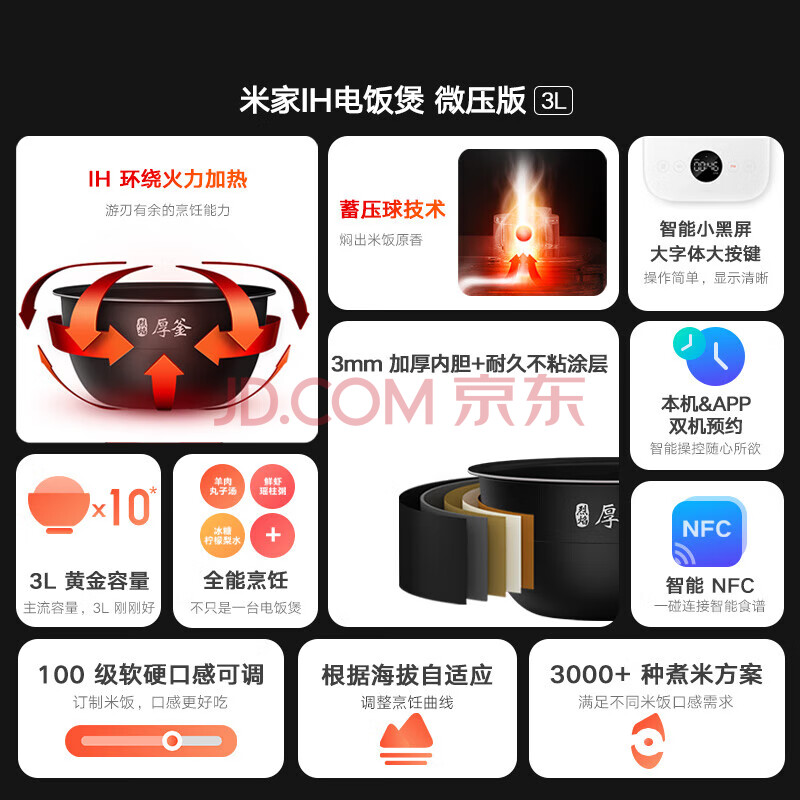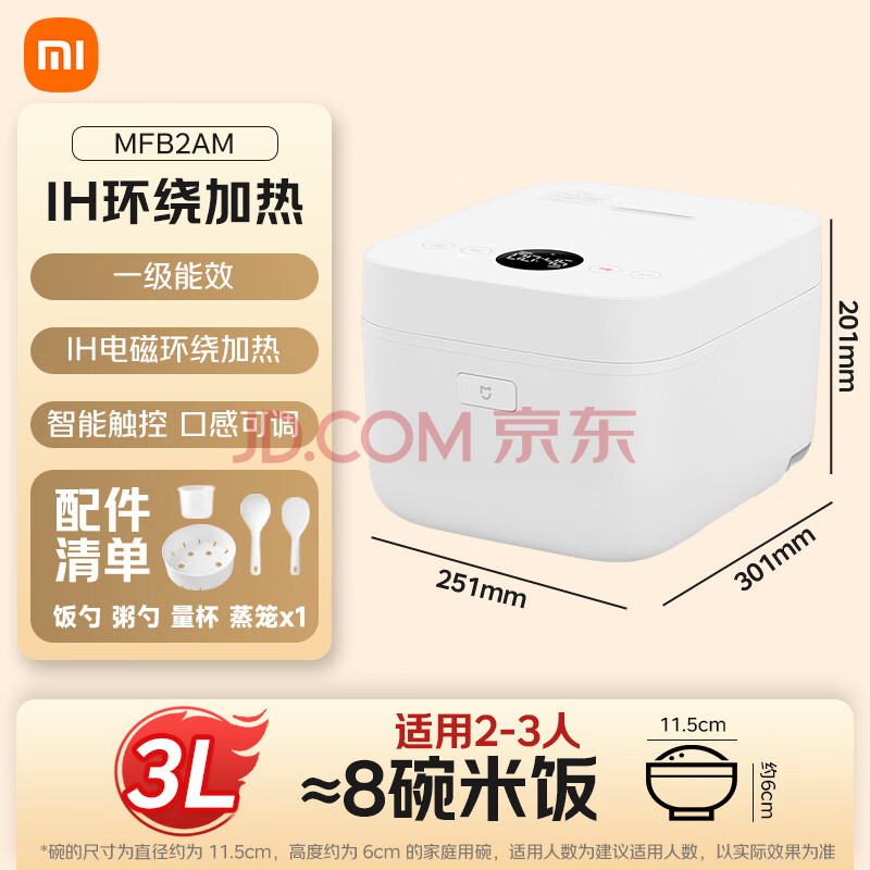 商品相册:米家小米电饭煲家用2-3人 智能微压IH多功能电饭锅煮饭 厚釜内胆不粘锅一级能效带蒸笼3升第