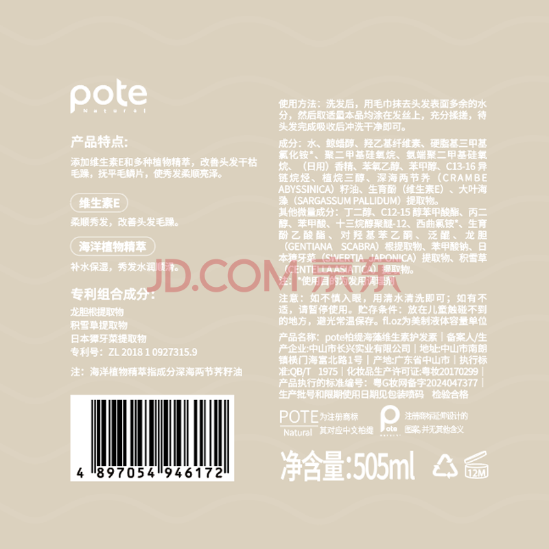 商品相册:柏缇海藻维生素E护发素 柔顺滋润修护干枯毛躁男女通用润发乳 505ml第