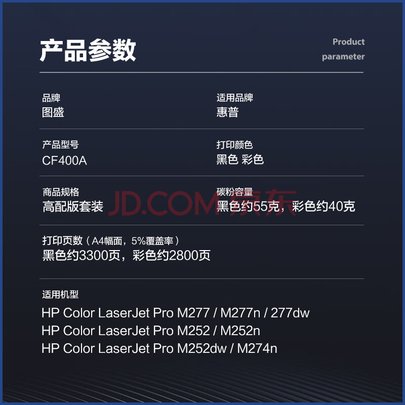 商品相册:图盛CF400A硒鼓适用惠普M277dw硒鼓HP M252 M252n M252dn M252dw M277N M274n打印机硒鼓墨盒201A粉盒CF400X四色第