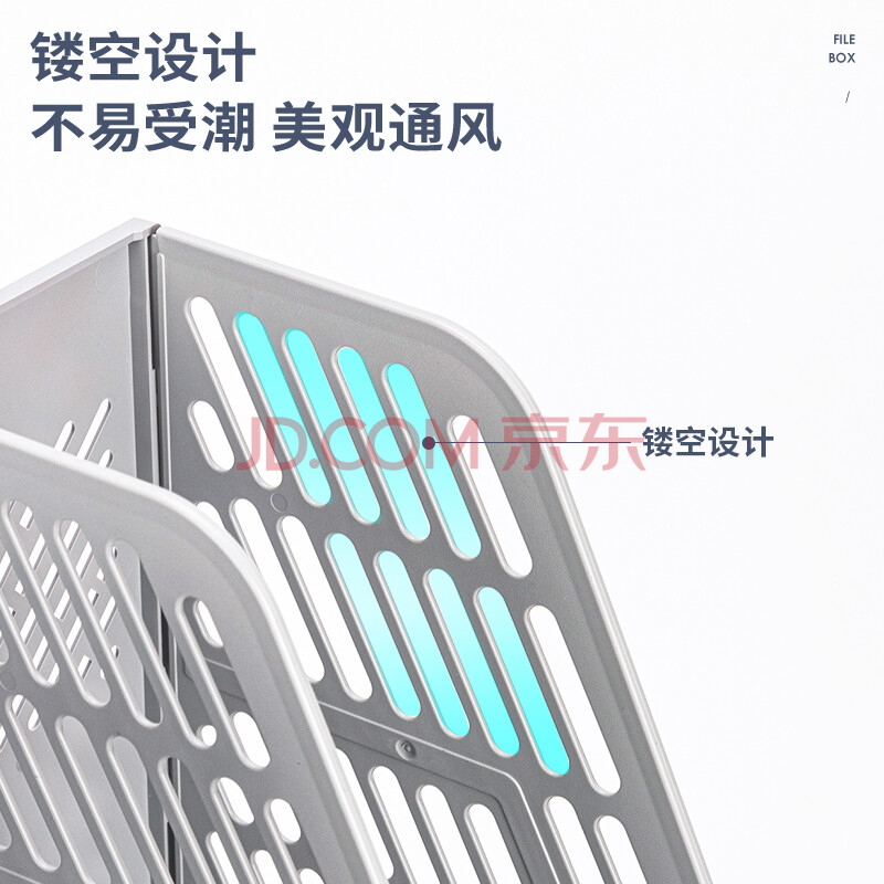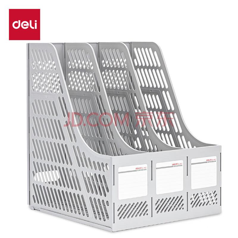 商品相册:得力(deli)三联镂空桌面文件框 办公室桌面多层资料架子 三栏带标签稳固文件栏/文件筐 灰色第