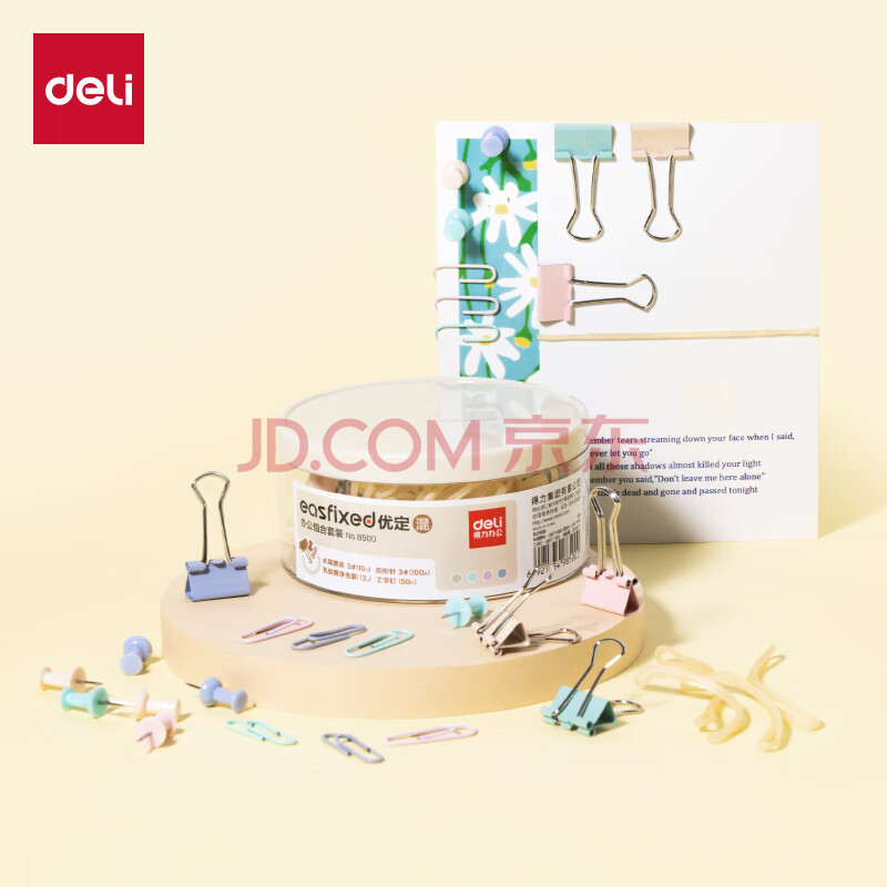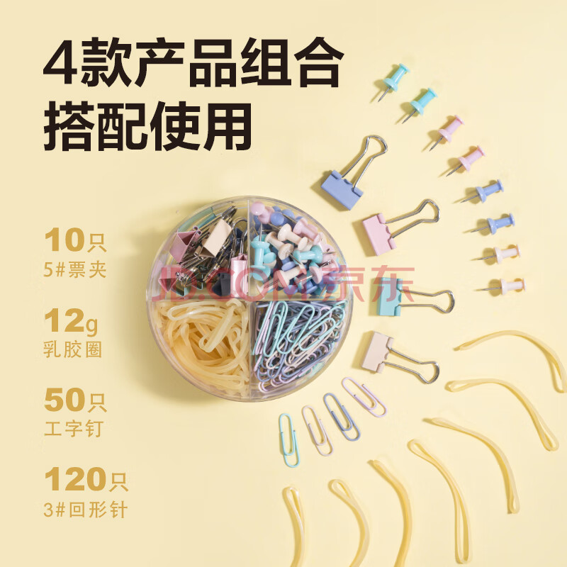 商品相册:得力(deli)四合一办公用品组合套装(19mm小号票夹10只+29mm回形针100只+工字钉50只+橡皮筋/盒 8500第