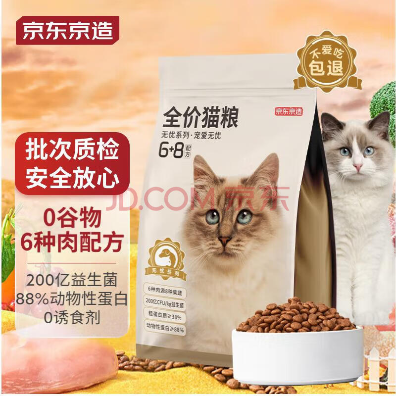 商品相册:京东京造 猫粮无谷6种肉猫粮1.5kg/3斤成幼猫通用营养均衡益生菌蔓越莓第