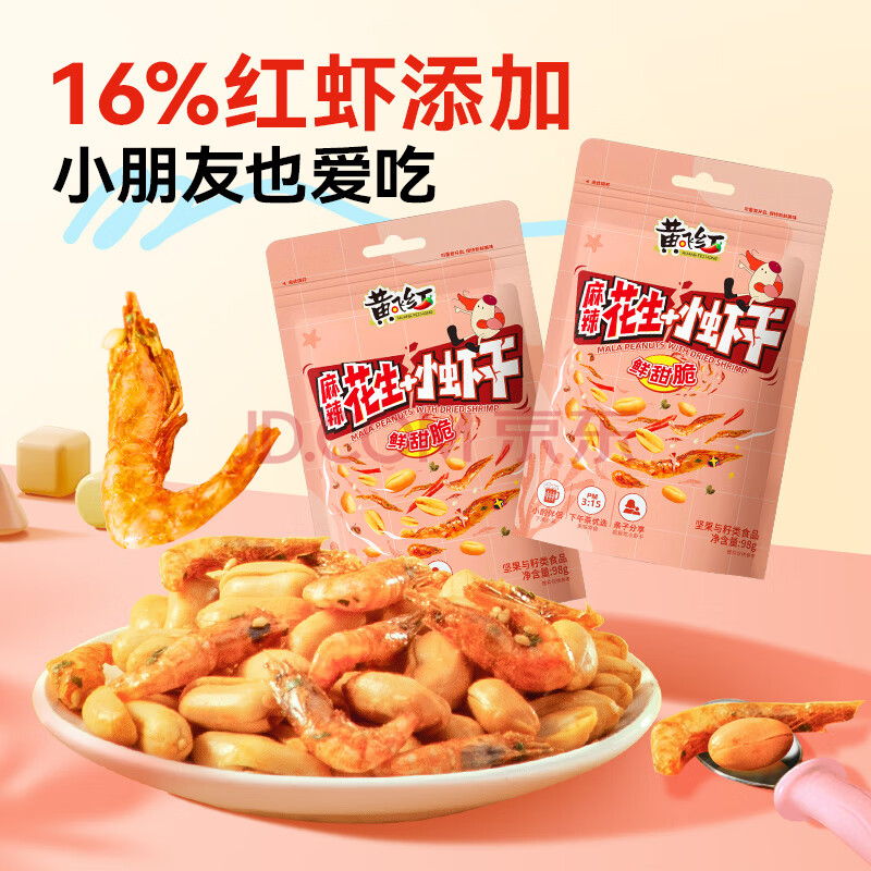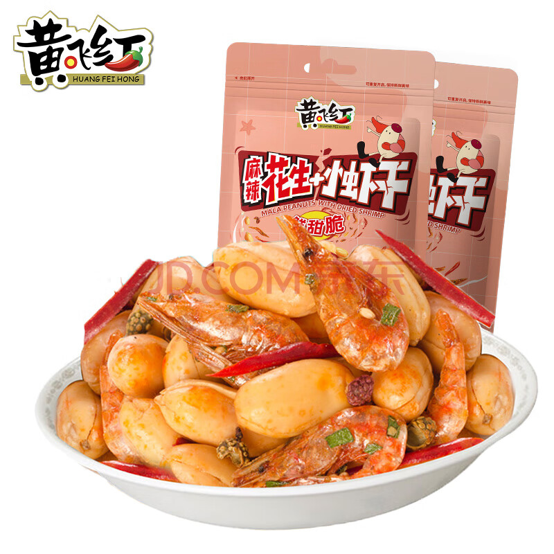 商品相册:黄飞红(HUANGFEIHONG) 麻辣花生小虾干花生米98g*2袋 休闲零食网红小吃下酒菜花生仁第