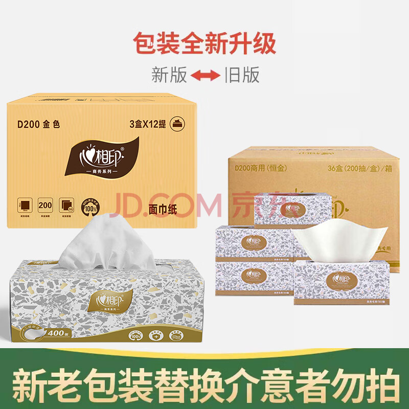 商品相册:心相印抽纸 D200 恒金办公室商用硬盒抽纸巾 2层*200抽/盒*36盒整箱第