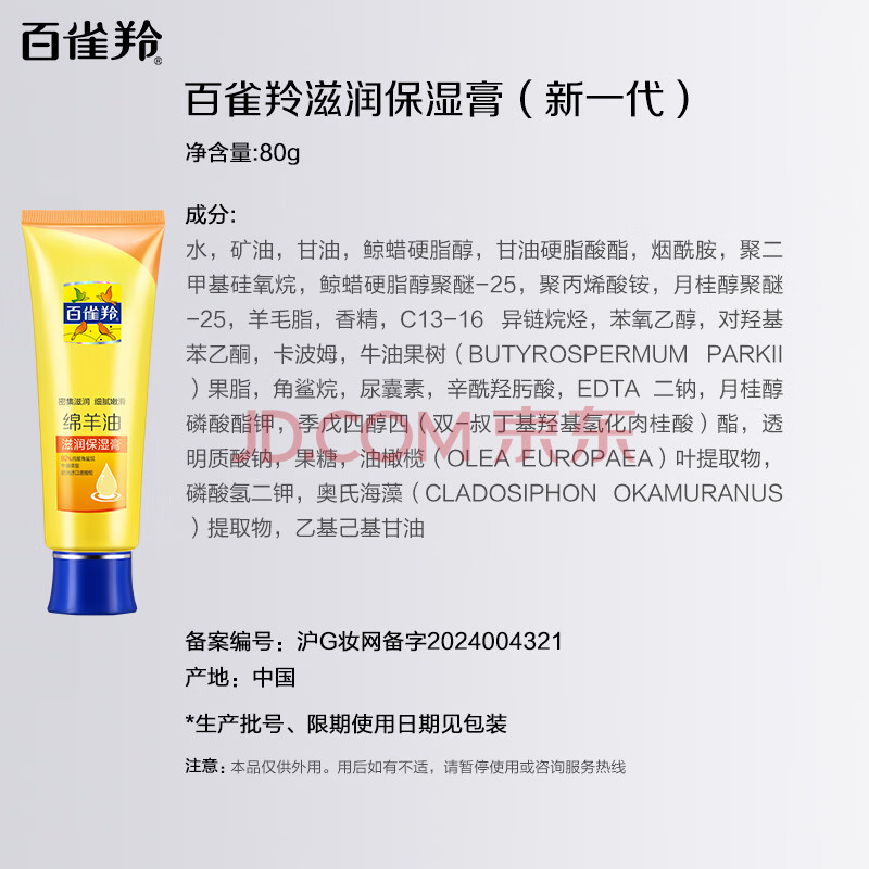 商品相册:百雀羚(PECHOIN) 滋润保湿膏绵羊油护手霜80g滋润保湿品质国货生日礼物第