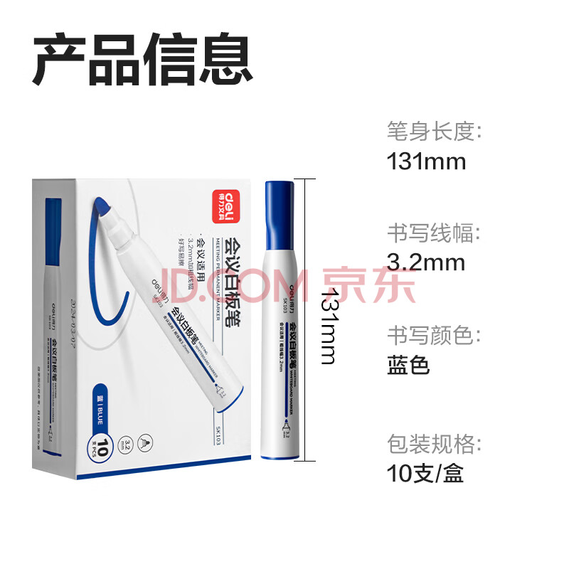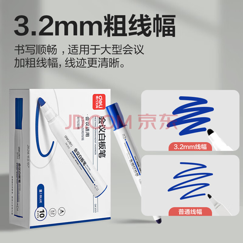 商品相册:得力(deli)粗头白板笔可擦易擦 办公教学会议蓝色10支/盒 SK103第