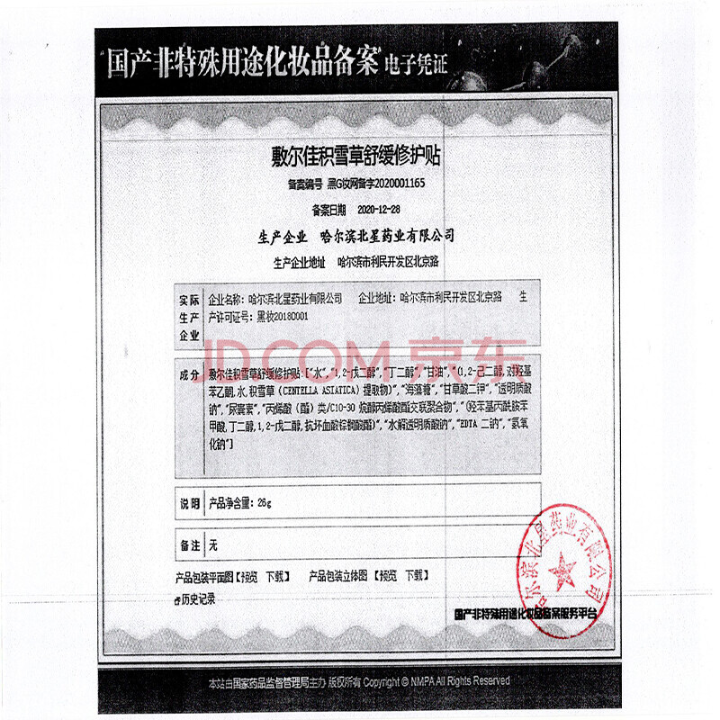 商品相册:敷尔佳 积雪草舒缓修复贴面膜(26g*5片/盒)第