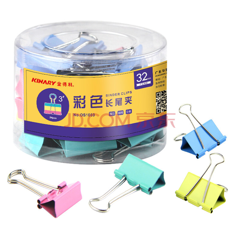 商品相册:金得利3#32mm彩色燕尾夹小夹子24只/桶装长尾夹金属票据夹防卷边文具文件夹蝴蝶夹鱼尾夹办公用品OS1003第