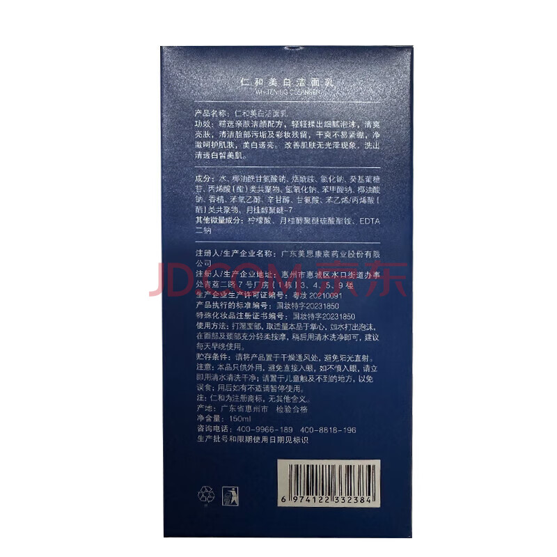 商品相册:仁和匠心美白洗面奶美白祛斑深层清洁毛孔男女士黑头粉刺氨基酸150g*2瓶装第