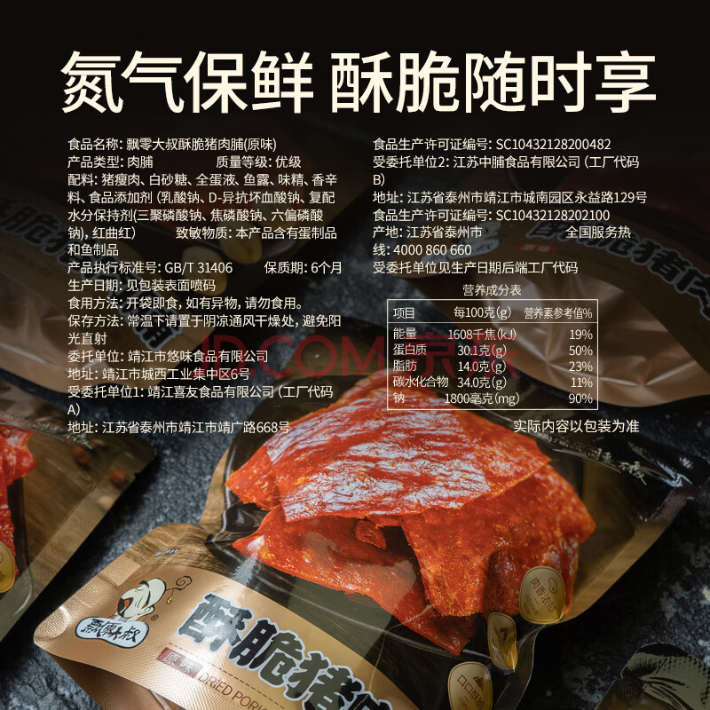 商品相册:飘零大叔酥脆猪肉脯芝麻味108g靖江特产猪肉干解馋办公室网红高蛋白零食第
