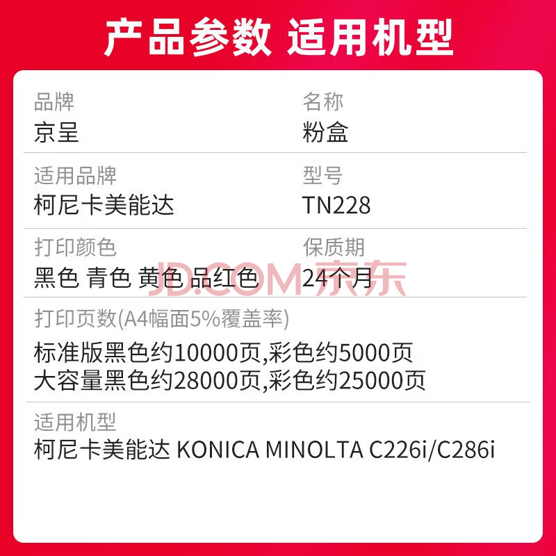 商品相册:京呈TN228粉盒适用美能达c226i柯美C286i C266i 复印机碳粉盒 TN228黑色粉盒大容量【28000页】第