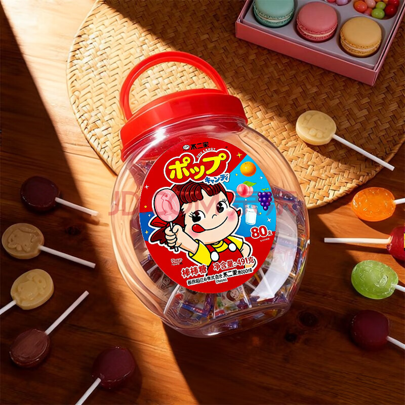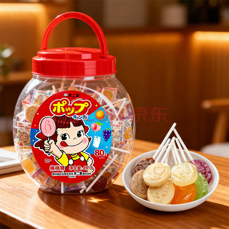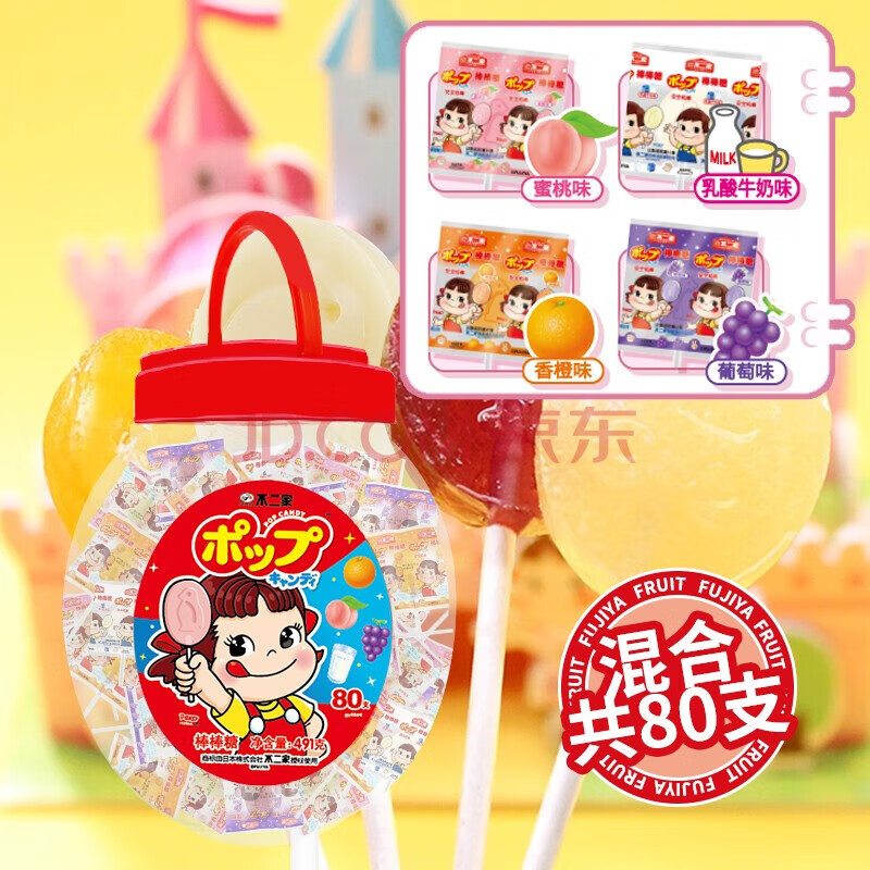 商品相册:不二家 混合口味棒棒糖手提桶装80支491g 纸棒水果味牛奶味儿童休闲糖果第