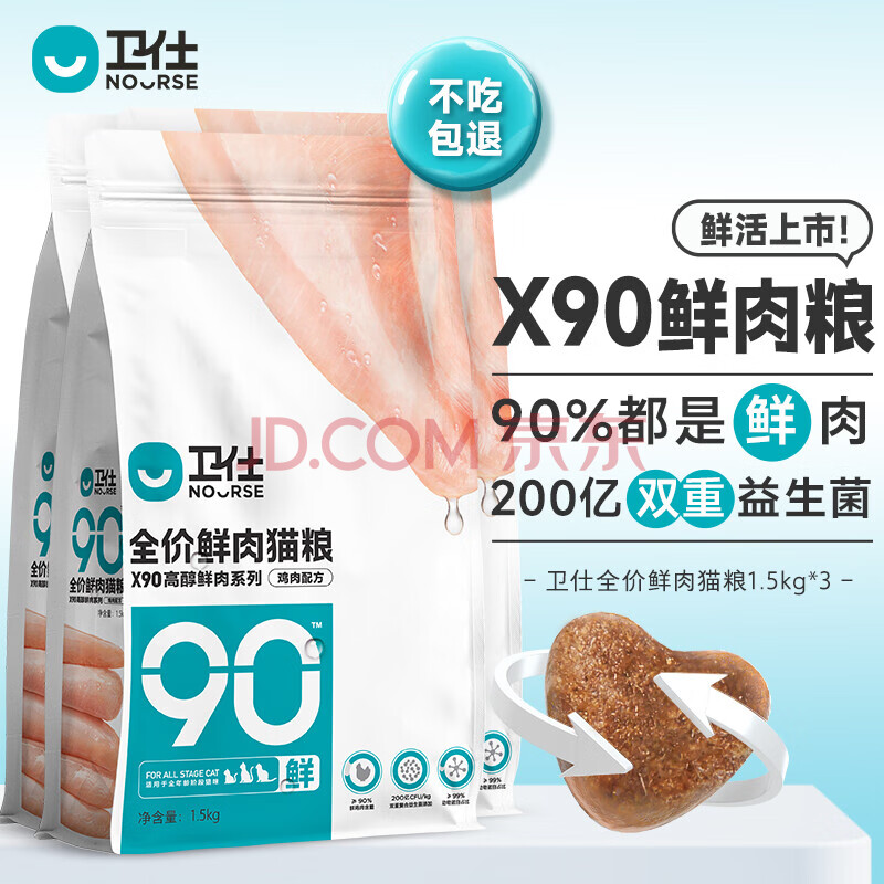 商品相册:卫仕 全价鲜肉猫粮 90%鲜肉含量 添加益生菌成猫幼猫通用 鸡肉味4.5kg第