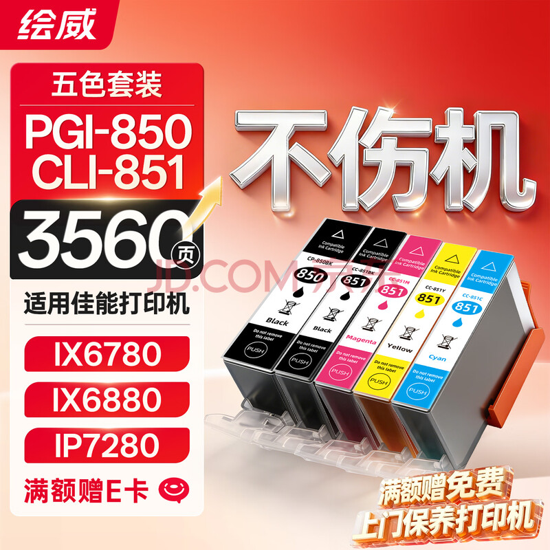 商品相册:绘威PGI-850XL墨盒 适用佳能IX6780 IX6880 IP8780 7280 MG7580 6400 6380 MX928打印机墨盒CLI-851 五色套装第