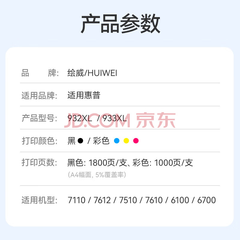 商品相册:绘威 932XL墨盒 适用惠普 7110 7612 hp officejet 7510 7610 933xl墨盒 6100 6700打印机墨盒 墨水 四色套装第