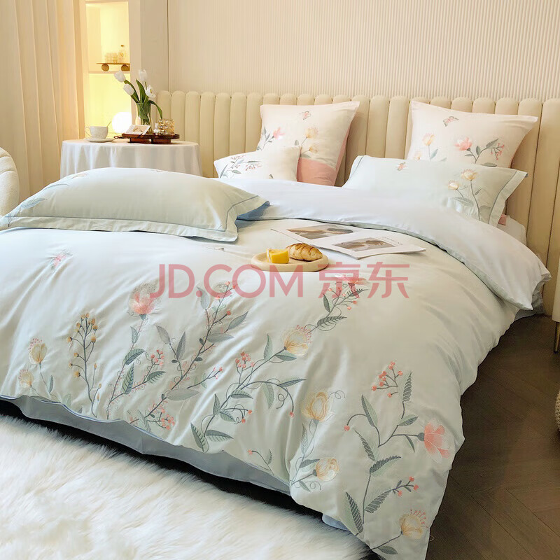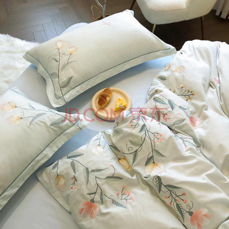 商品相册:Demichel 60支刺绣长绒棉四件套纯棉 法式高端全棉床上被套床单 1.8/2米床 莫兰迪绿第