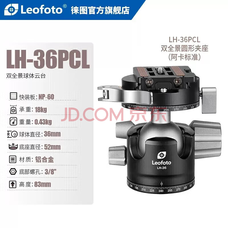 商品相册:徕图(Leofoto)云台 低重心双开口双全景夹座摄影摄像相机微单单反稳定专业球形云台 LH-36PCL第