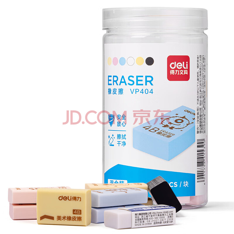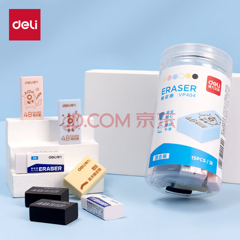 商品相册:得力(deli) 15块装混色桶装橡皮擦 中考高考美术绘图橡皮柔软易擦少屑学生开学文具第
