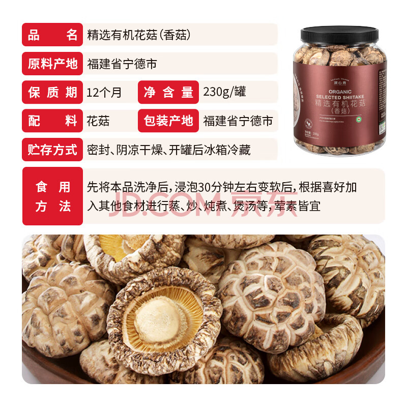 商品相册:湖心泉有机花菇230g 罐装剪脚大冬菇肉厚南北干货煲汤火锅食材干香菇第