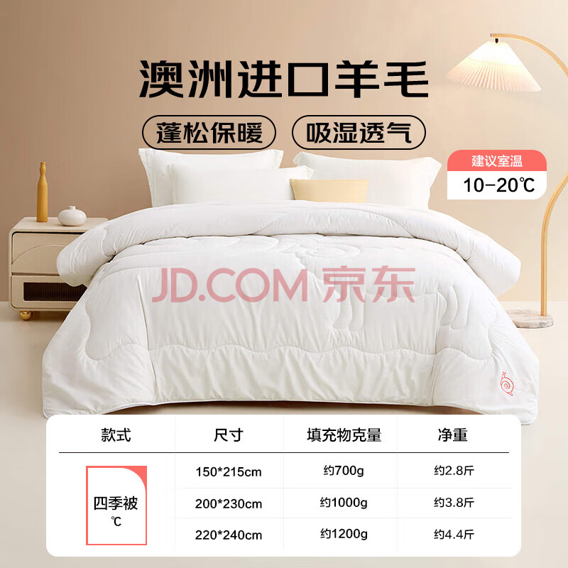 商品相册:LOVO罗莱家纺 100%澳大利亚羊毛四季被子2.8斤150*215cm 白色第1张/共3