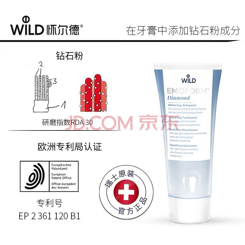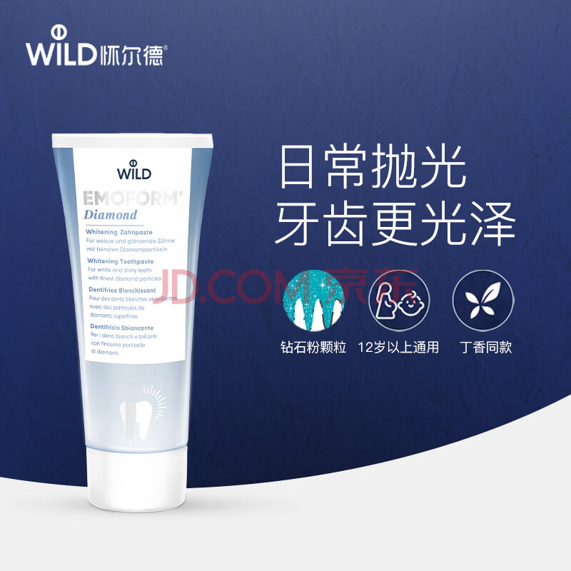 商品相册:怀尔德牙膏亮白去渍抛光 去黄去烟渍去牙垢瑞士原装进口钻石粉75ml套装第