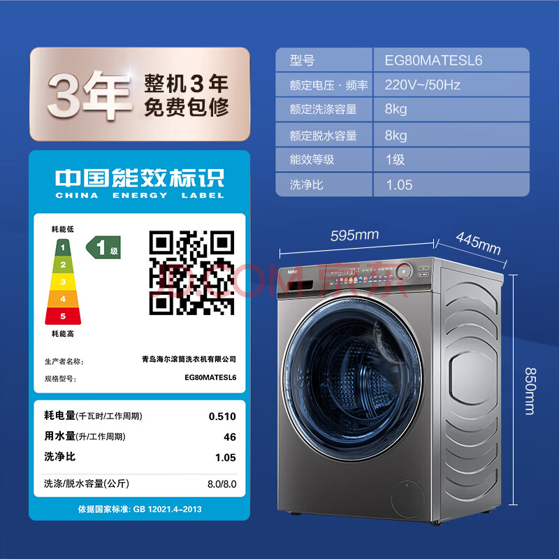 商品相册:海尔(Haier)全自动滚筒洗衣机小型 8KG 超薄平嵌 宿舍出租房用 家电京东自营 EG80MATESL6第