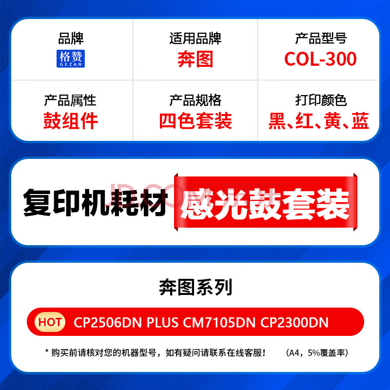 商品相册:格赞 COL-300感光鼓套鼓四色套装适用奔图PANTUM CP2506DN PLUS粉盒CM7105DN CP2300DN硒鼓墨盒CTL-300鼓组件第