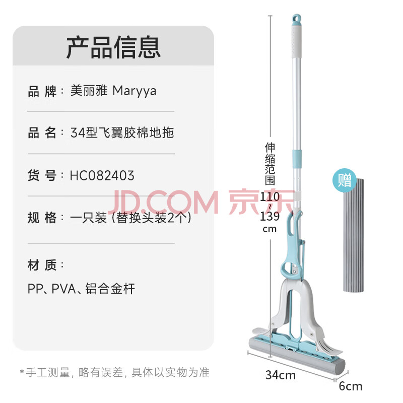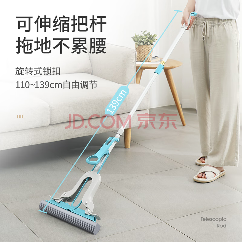 商品相册:美丽雅胶棉拖把34cm伸缩杆139cm2拖头吸水海绵干湿两用免手洗一拖净第