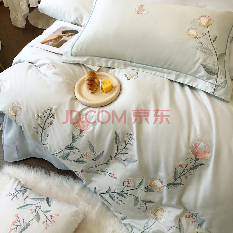 商品相册:Demichel 60支刺绣长绒棉四件套纯棉 法式高端全棉床上被套床单 1.5/1.8米床 莫兰迪绿第