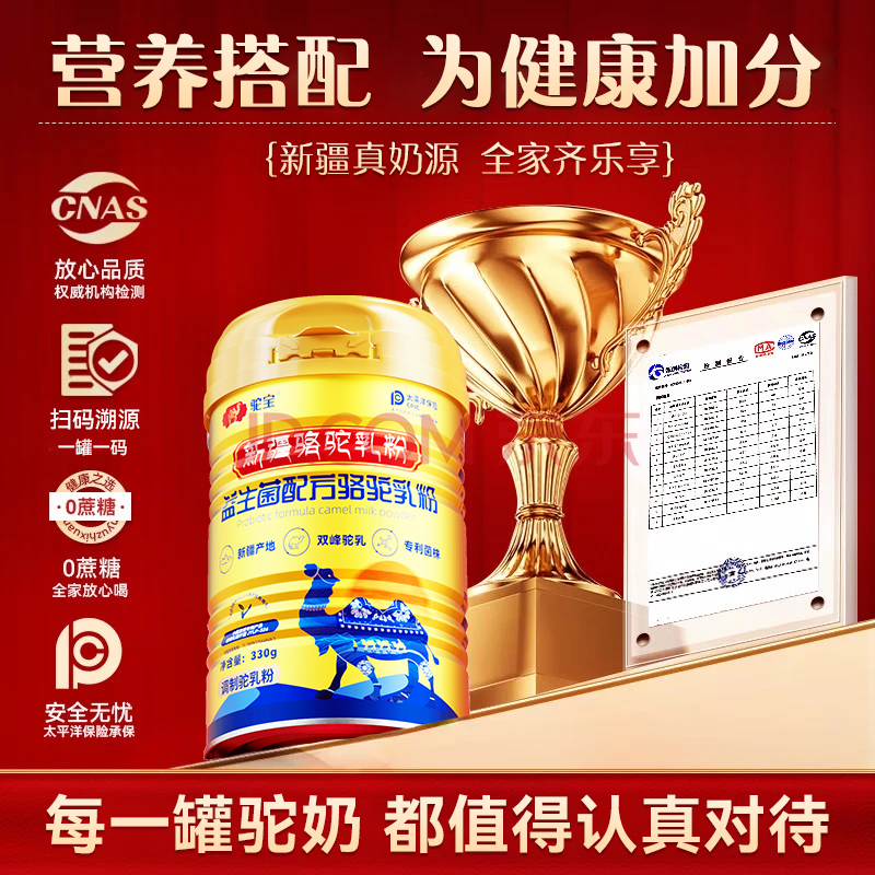 商品相册:驼宝益生菌配方骆驼乳粉 新疆正宗奶源中老年驼奶零蔗糖330g*3罐礼盒第