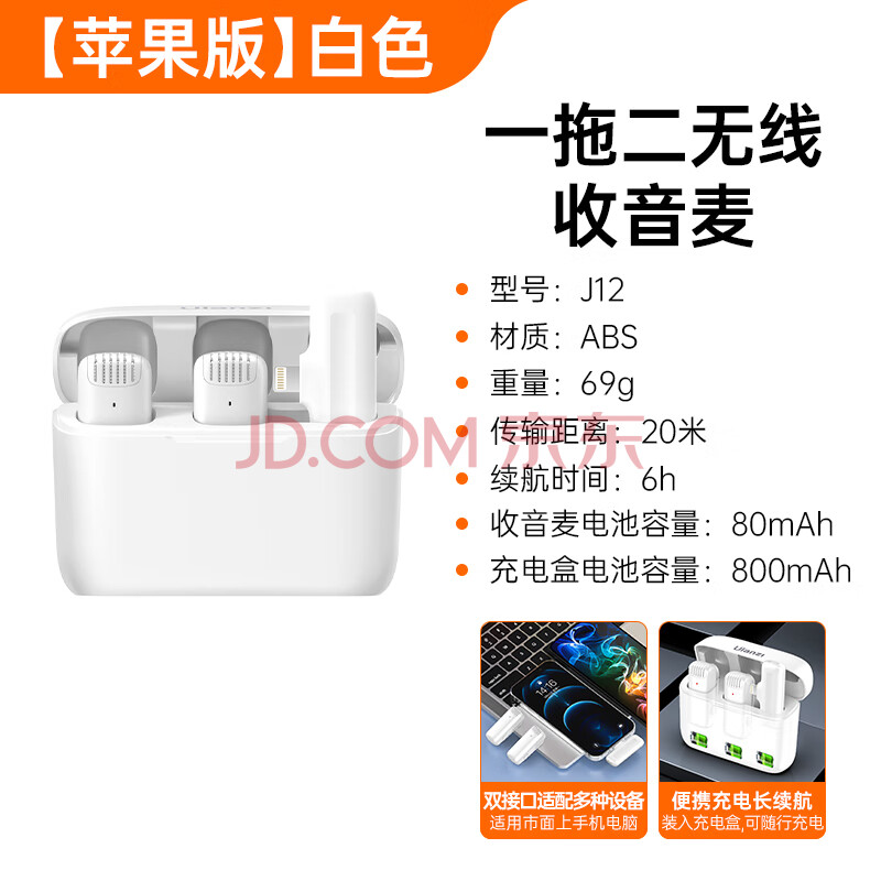 商品相册:ulanzi优篮子 J12(lighting版)一拖二无线领夹麦克风收音麦收音器专业vlog拍视频户外采访录音直播第