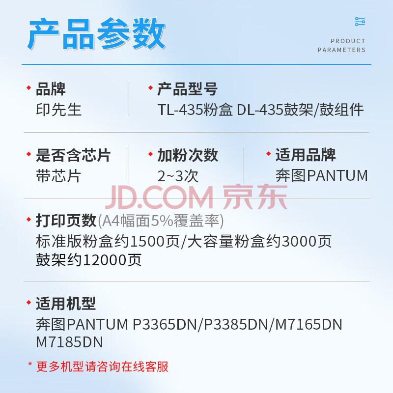 商品相册:印先生TL-435大容粉盒带芯片 适用奔图P3365DN P3385DN M7165DN M7185DN DL-435成像鼓碳粉盒墨盒保密机硒鼓第