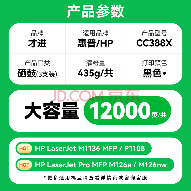 商品相册:才进适用惠普m1136硒鼓m126a/nw plus打印机墨盒cc388a晒鼓m126snw plus易加粉88a一体机粉盒碳粉墨粉P1108/P1106第