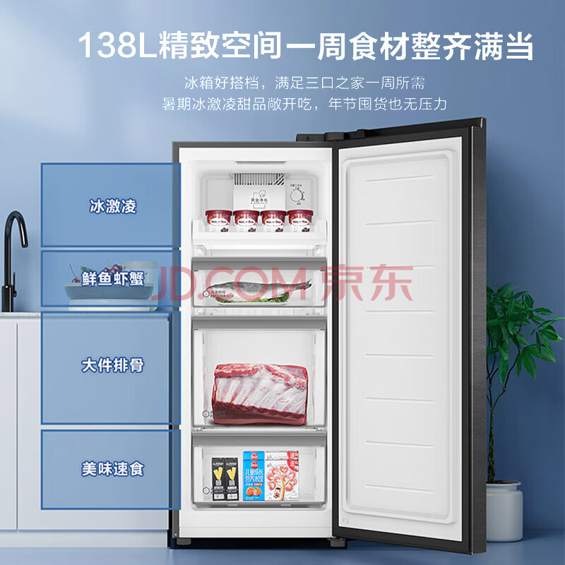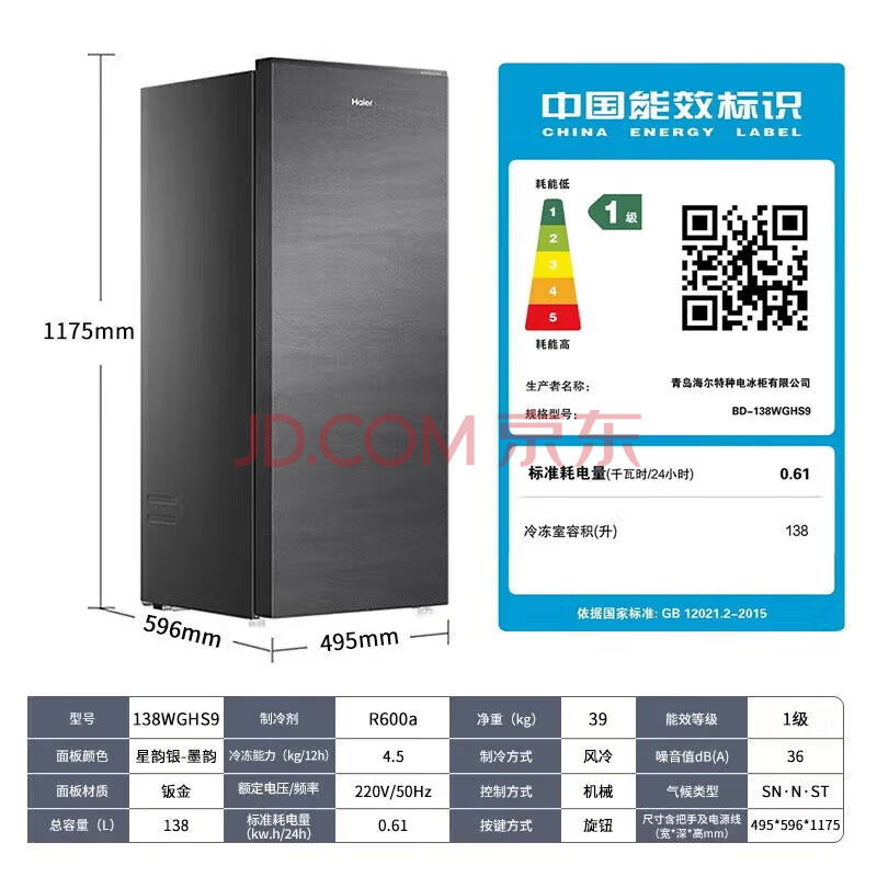 商品相册:海尔冷柜138升立式冰吧一级能效冷藏冷冻一键转换分区抽屉式风冷无霜家用商用BD-138WGHS9第