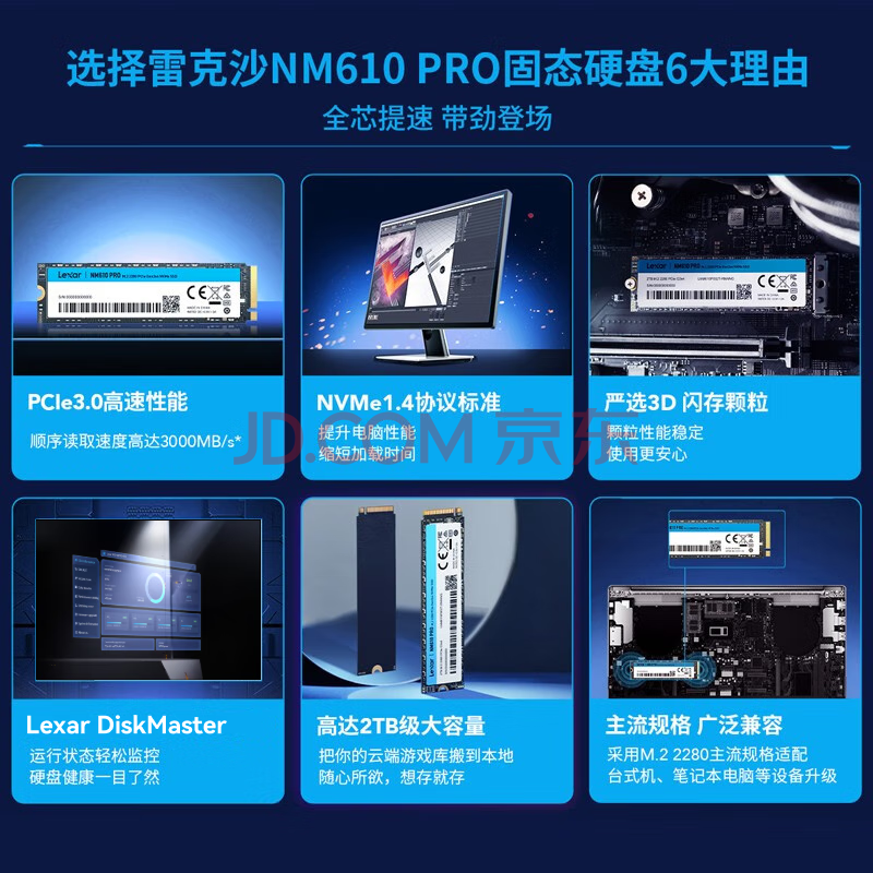商品相册:雷克沙(Lexar) 500G SSD固态硬盘 M.2接口 NVMe协议(PCIe 3.0x4)读速3000MB/s NM610PRO快速加载广泛兼容第