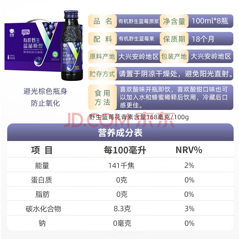 商品相册:永富100%有机野生蓝莓原浆800ml大兴安岭特产 富含花青素不加一滴水第