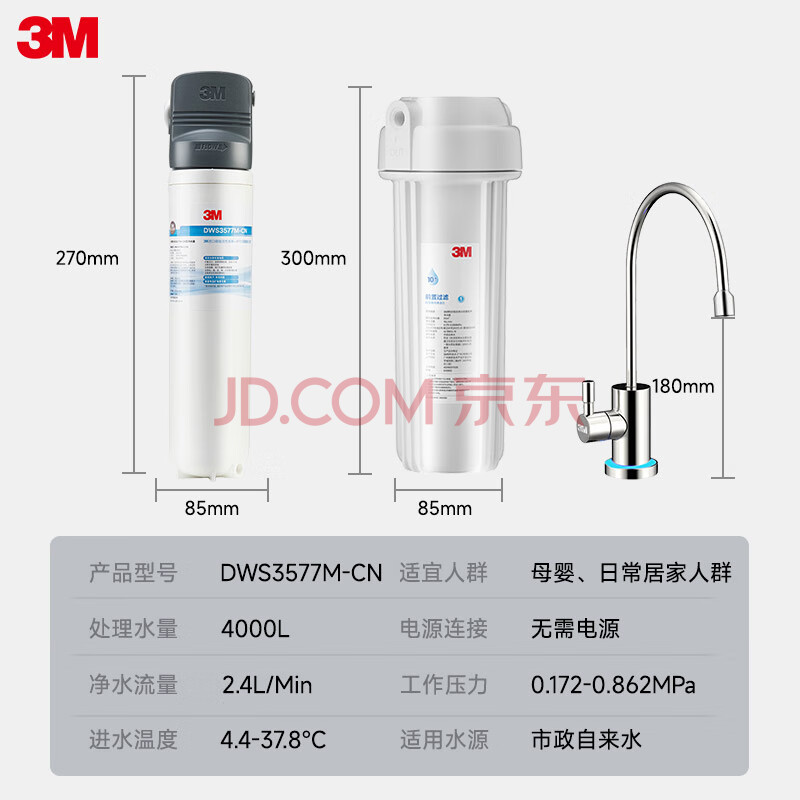 商品相册:3M净水器家用净水机0废水直饮智能矿物质2.4L/分4000升处理量800G过滤器前置DWS3577-CN第