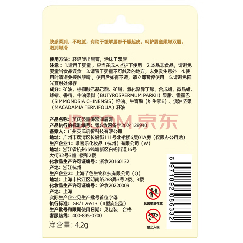 商品相册:英氏儿童唇膏 婴儿润唇膏 嘴唇保湿油脂锁水 凡士林滋润防干裂 4.2g第