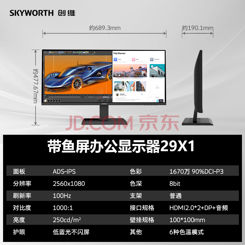 商品相册:创维29英寸 带鱼屏 显示器 莱茵低蓝光 21:9 准2K 100Hz ADS-IPS 阅读模式 办公电脑显示屏 29X1第