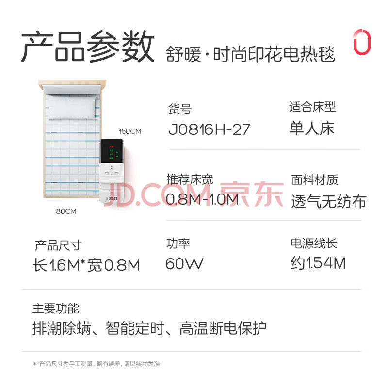 商品相册:彩虹【高温断电】单人智能定时除螨无纺布电热毯电褥子1.6*0.8米第