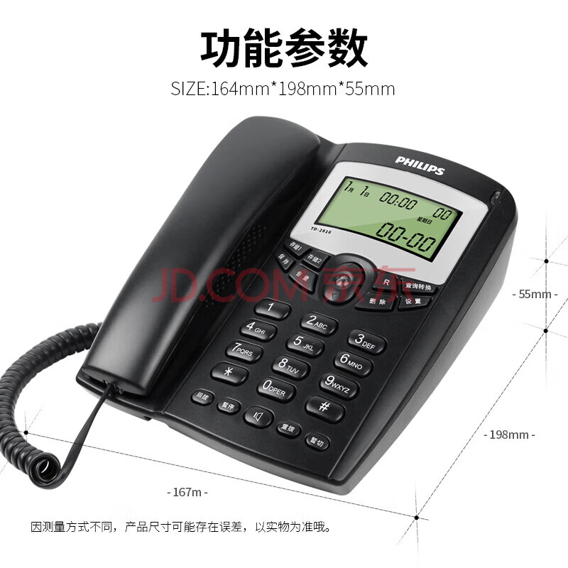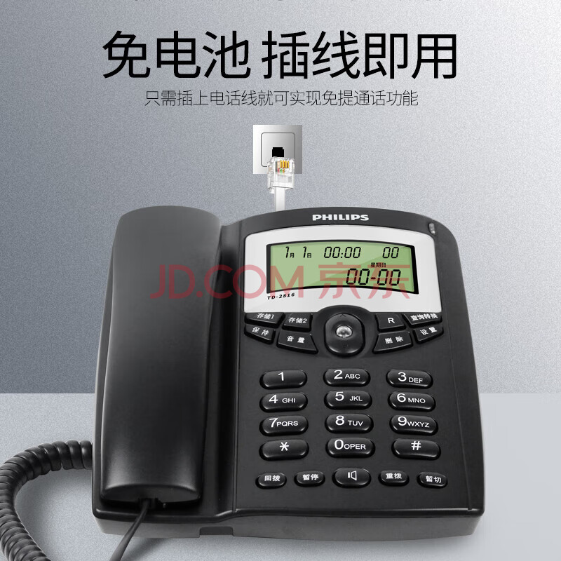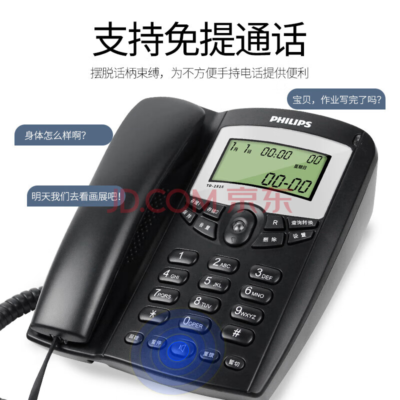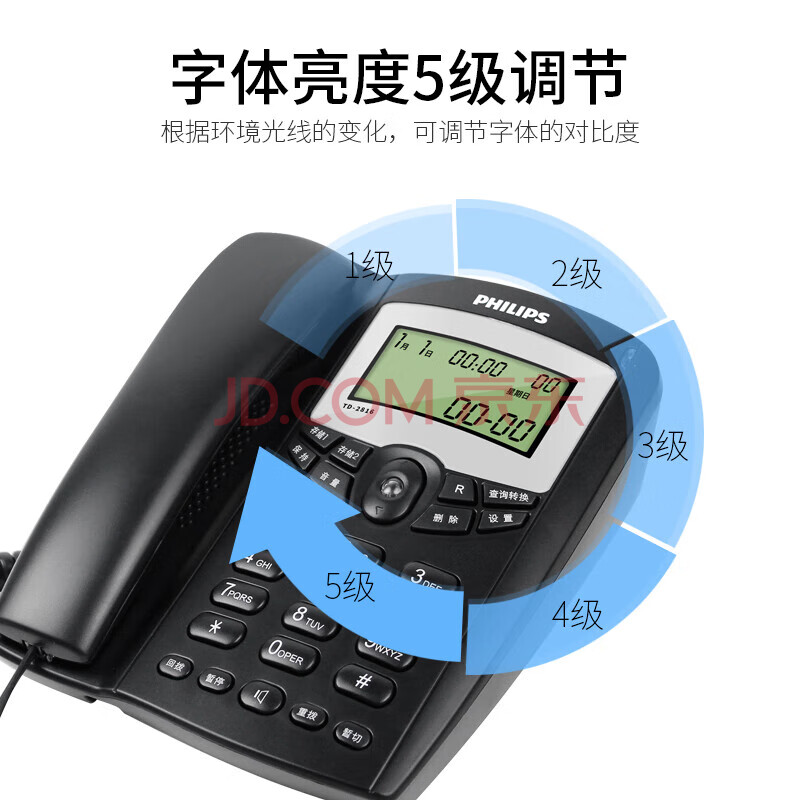 商品相册:飞利浦(PHILIPS)电话机座机 固定电话 办公家用 免电池 来电显示 双插孔 TD-2816 (蓝色)第