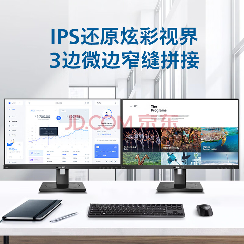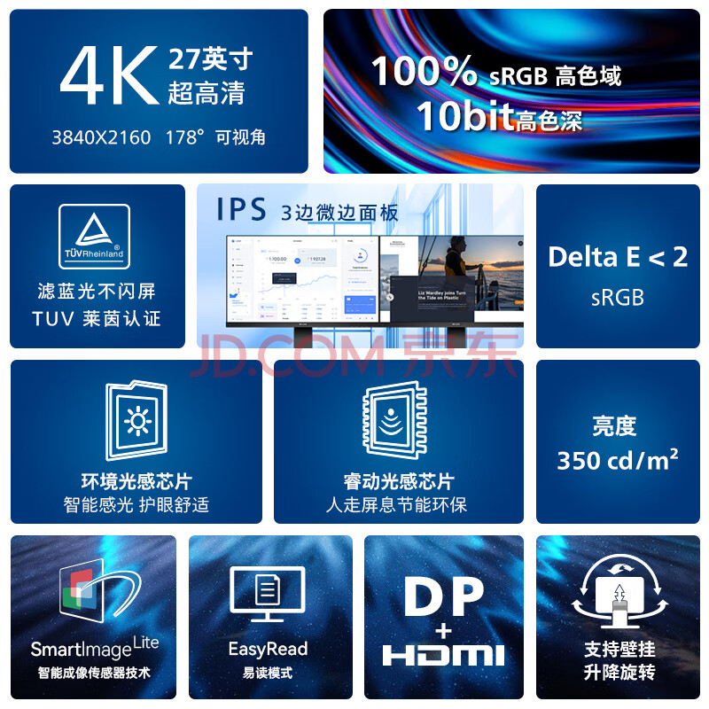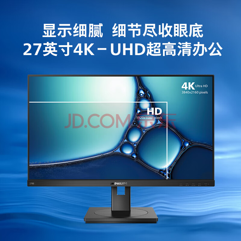 商品相册:飞利浦(PHILIPS)27英寸 4K显示器 IPS 100%sRGB TUV滤蓝光护眼 升降旋转 智能双芯 办公设计电脑显示屏 278B1N第