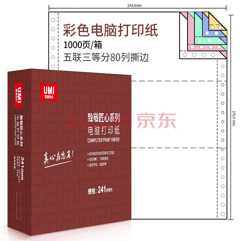 商品相册:安兴五联三等分撕边彩色电脑打印纸 单据通知单针式打印纸(241-5-3/3S 色序:白红绿蓝黄 1000页/箱)第